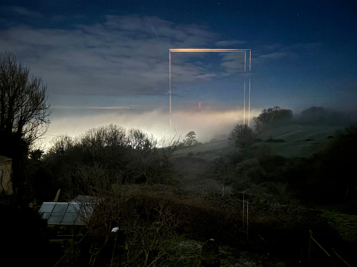 My view on New Year’s Eve. Lights glow through fog, the reflected outline of my bathroom door, like a portal, and the distant line of the Mendip Transmission Mast on the Mendip Hills.